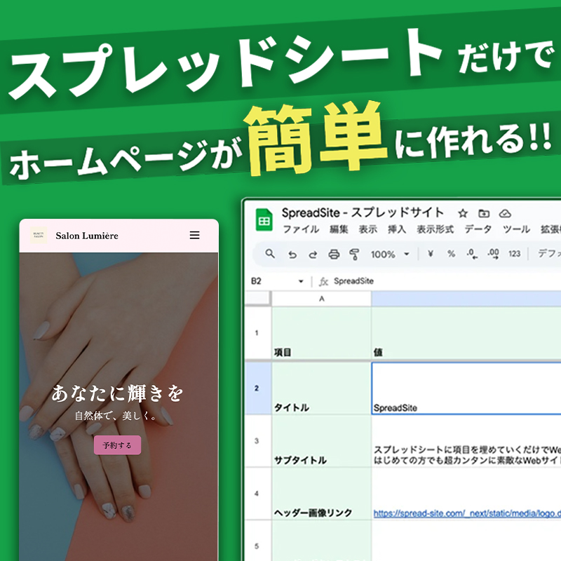 美容室等のサロン、飲食店、クリエイター etc.時間もお金もかけられない、でも、事業の魅力は届けたい!そんな多忙な個人事業主や中小企業オーナーのために!使い慣れたスプレッドシートの感覚で、PCでもスマホでも見やすい高品質なデザインのHPを簡単に構築・更新。内容変更もリアルタイムで即反映!専門知識不要、短時間・低予算で、初めての方でも簡単にHPを公開できるサービスが誕生!